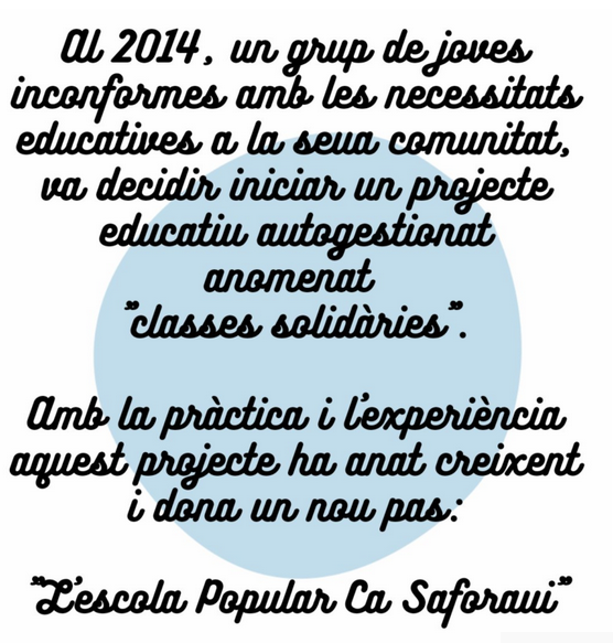 Espai d’aprenentatge comú on s’imparteixen coneixements diversos per tal de pal·liar els efectes que l’estructura econòmica actual, que impossibilitat a les persones amb mancança de recursos gaudir d’un lloc extraescolar de reforç educatiu. A la nostra escola s’imparteixen de manera gratuïta classes de llengua espanyola, valenciana i classes de reforç escolar durant diversos dies de la setmana. Al mateix temps, aquest espai crea un nexe multicultural de reciprocitat intergeneracional on totes aprenem de totes, des de valors fins a la pròpia cultura.